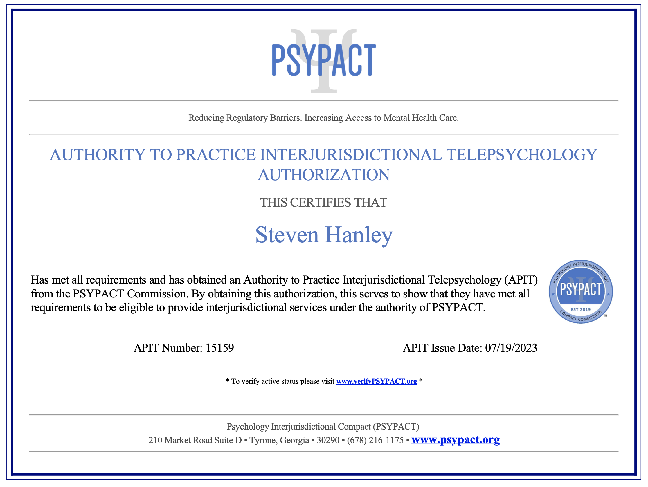 Dr. Steven J. Hanley now offers Telehealth Therapy visits to a growing number of states across the country.